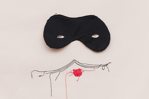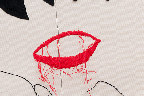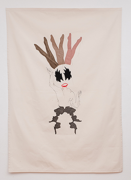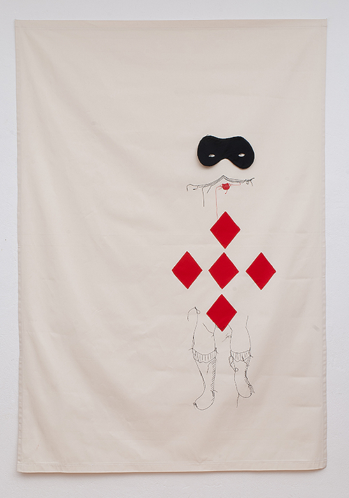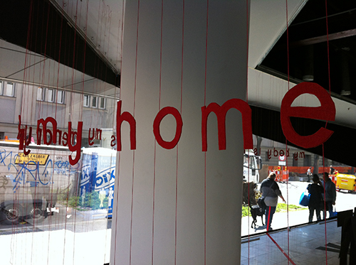 Schnüre, Klebeband, Filzbuchstaben auf Wolle zwischen Decke und Boden gespannt