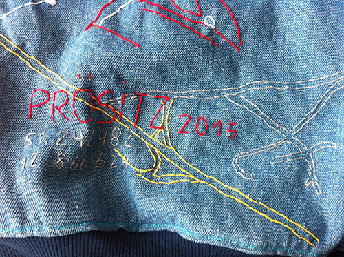 Die bestickte Jacke Prösitz mon amour entstand während meines Stipendiumaufenthaltes 2015 im Künstlergut Prösitz, sie konserviert das Sticken, den handwerklichen Vorgang und die Erinnerungen an den Ort Prösitz. Auf der Jacke konzentrieren sich die Erinnerungen an die Personen und ihre Tätigkeiten auf ein einziges sinngebendes Motiv, zum größten Teil wurden mir die Zeichnungen von den Menschen vor Ort gegeben.