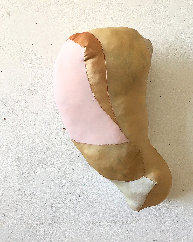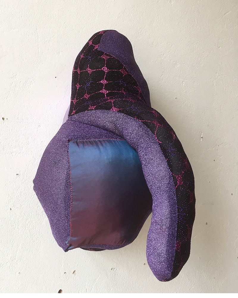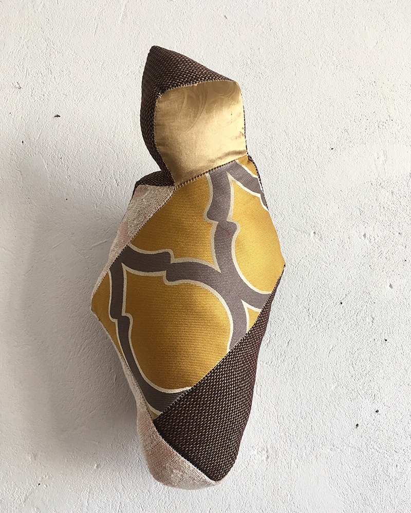 For the wallobjects I use restmaterial of fabric, which I intuitively sew together, without knowing how the result will look like. The objects are stuffed with soft filling.